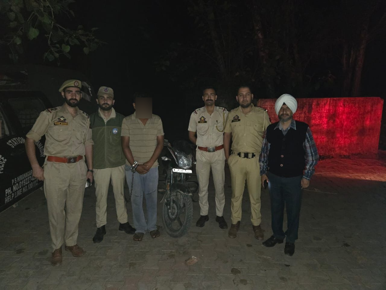 KATHUA; 29 OCT :- J&K Police Kathua under the overall supervision of *SSP Kathua Ms. Mohita Sharma -IPS* has recovered 5.88 grams of Heroin(Chitta) like substance from Shamshan Ghat area of PS Hiranagar and one drug peddler arrested and seized the vehicle(motorbike) involved. On 28/10/2025 a Police team of PS Hiranagar led by Insp. Ashish Sharma under the close supervision of *SP Ops Kathua Sh. Mukund Tibrewal IPS and SDPO Border Sh. Dheeraj Katoch* established a routine naka at Hiranagar area to keep a check on suspicious movement and illegal activities. During naka duty, the police party noticed one person en routed on motorbike bearing Reg. No. JK08P-6251 under suspicious manner. On being stopped and questioned, he disclosed his identity as 1. Ajay Kumar S/o Darshan Lal R/o Kattal Gujjaran. Upon his personal search, *5.88 grams* of Heroin Chitta like substance have been recovered from his possession. Accordingly, a case FIR No. 153/2025 U/S 8/21/22/ NDPS Act was registered at Police Station Hiranagar , and the accused was taken into custody on the spot. The recovered contraband has been seized as per legal procedures, and further investigation is in progress to trace the source and linkages of the narcotic supply.