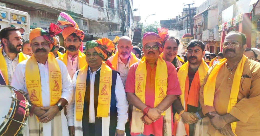A grand Shobha Yatra dedicated to Bhagwan Valmiki Ji was today flagged off by Sat Sharma (CA), President, J&K BJP, and Yudhvir Sethi, MLA Jammu East, from Dogra Hall, Jammu.