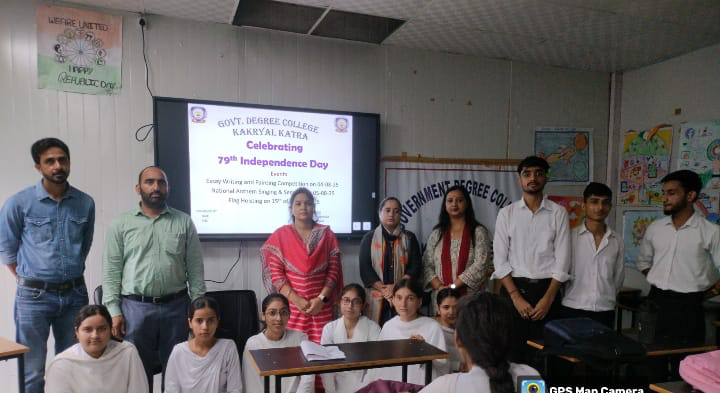 Government Degree College Kakryal, Katra, organized Essay Writing and Painting Competitions on the eve of 79th Independence Day i.e. 15th of August 2025. The events were conducted as part of the week-long celebrations aimed at instilling patriotic fervor among students and commemorating the sacrifices made by freedom fighters. The programme was organized under the guidance of the worthy Principal, Dr. RajniBhagat. Students from various semesters enthusiastically participated in both events, showcasing their talents and patriotic spirit.The theme for the essay writing competition was “Role of Education in Promoting Peace”. In total eight number of students participated in the competition who presented insightful perspectives on the role of education in promoting peace in India. Their essays reflected awareness of current challenges as well as optimism for a better future. Ayushi Thappa (5th sem) secured first position, Shivani Charak (5th sem) bagged 2ndposition and Raghav (5th sem) and Sakshi (5th sem) secured third position. The judges for the event were Dr. Sajaad Iqbal, Prof. Nasar Ahmed and Dr. Harmeet Kour. The theme for the painting competition was “Potraits of Unsung heroes of Indian Independence”. The artworks were judged based on creativity, relevance to the theme, and presentation. Sakshi (5th sem), Mamta (1st sem) and Shilpi (3rd sem) bagged Ist, 2nd and 3rdposition respectively. The faculty members who judged thepainting competition were Prof. Shikha Bhasin and Dr. UshaSharma. The competitions provided a platform for students to express their views and sentiments creatively while honoring the spirit of Independence Day. The event concluded with a vote of thanks delivered by the event coordinator, Dr. Usha Sharma,expressing gratitude to all participants, judges, and staff for their cooperation in making the program a success.