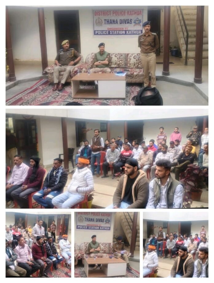 Kathua; 14 Nov:- J&K Police Kathua under the overall supervision of *SSP Kathua Ms. Mohita Sharma IPS* yesterday organised Thana Diwas at PS Kathua. The function was presided over by *Addl. SP Kathua Sh. Rahul Charak JKPS* accompanied by *DySP Hqrs Kathua Sh. Ravinder Singh & SHO PS Kathua Insp. Sandeep Chib* . The meeting was attended by 70-90 locals, including PRI’s, Pradhan Byopar Mandal and other respectable citizens of the area.