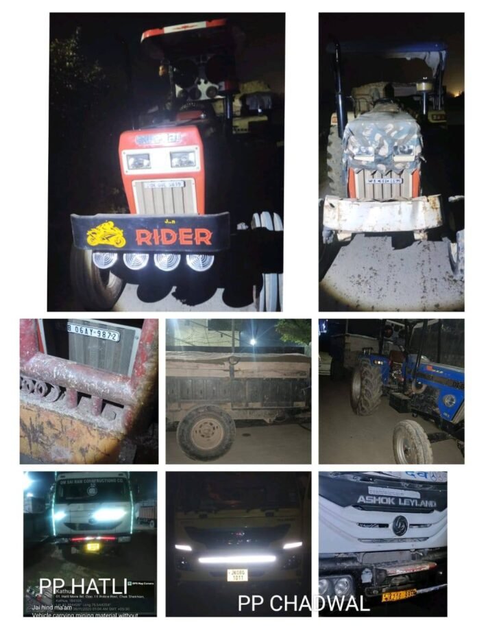 While in the second instance police team led by IC PP Chadwal under the guidance of *SP Ops. Kathua Sh. Mukund Tibrewal IPS* & SDPO Border while performing patrolling duty in their jurisdictional area, have seized 06 vehicles i.e 04 Tractor alongwith Trolleys & 02 dumpers bearing Reg. No.s JK08Q-1011 & JK21G-9959 indulged in illegal mining / transportation of construction material without any legal permission. Moreover, police team of PP Hatli under the guidance of *DySP Hqrs Kathua* also seized one dumper bearing Reg. No. Jk08P-9913 indulged in transportation of mining material without A Form.