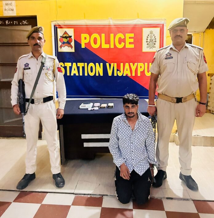 Samba, July 24, 2025: Continuing its drive against drug smugglers/suppliers, Samba Police has arrested one drug peddler alongwith 10 grams heroin (chitta) like substance, cash of rupees 1.04 lacs and one weighing machine from his possession in the jurisdiction of Police Station Vijaypur.