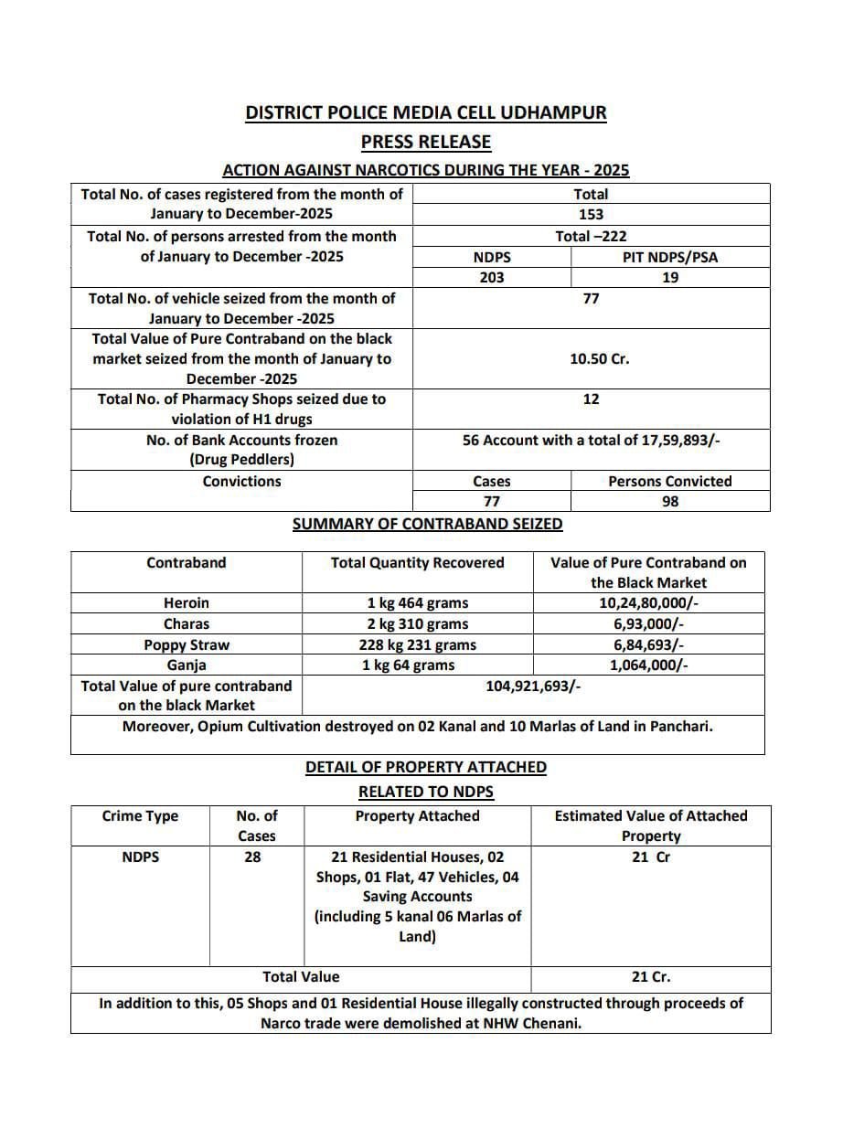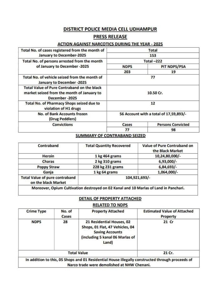During the year 2025, Udhampur Police intensified its drive against drug trafficking under Nasha Mukt Abhiyaan.*From January to December 2025, 153 NDPS cases were registered, leading to the arrest of 203 drug smugglers. 19 hardcore narcotics smugglers were booked under PIT NDPS.*